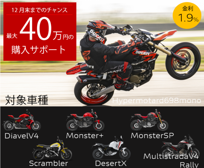 ドゥカティの残価設定型ローン、デスモプランをご利用して対象車種をご購入いただいた方に、最大で40万円の頭金をサポート( ゚Д゚)