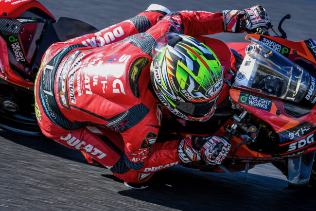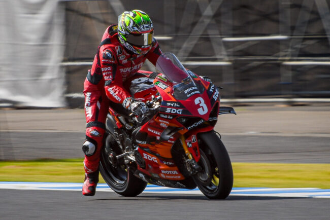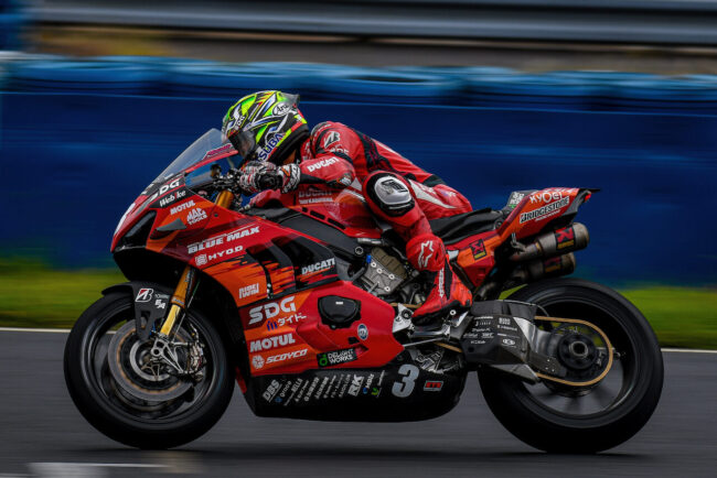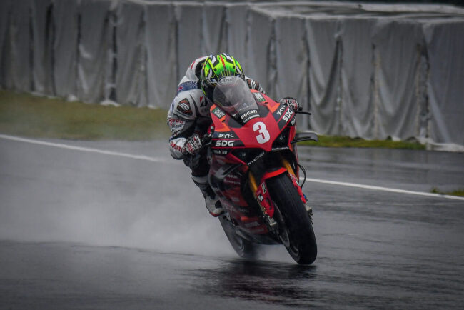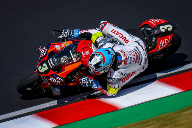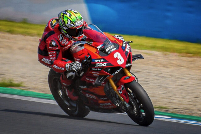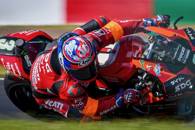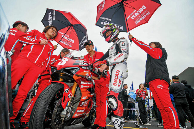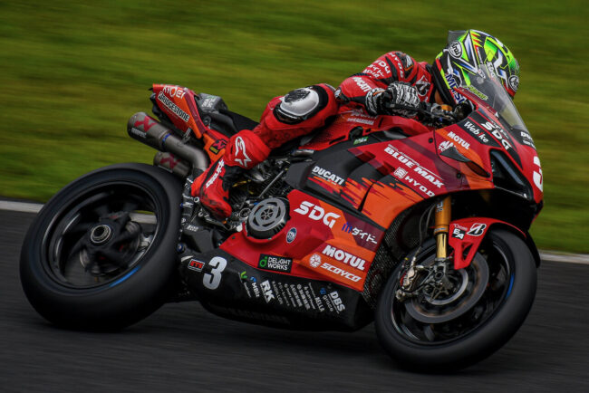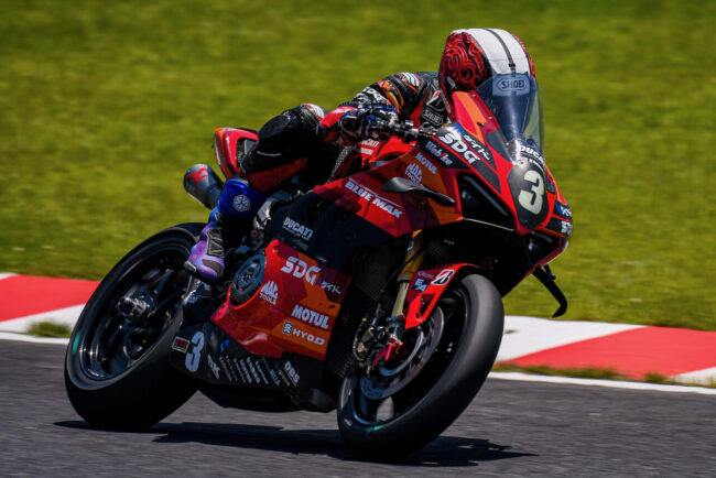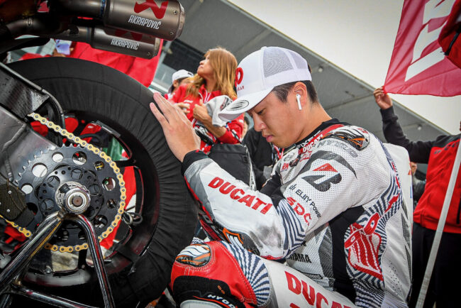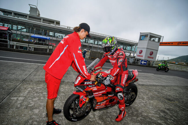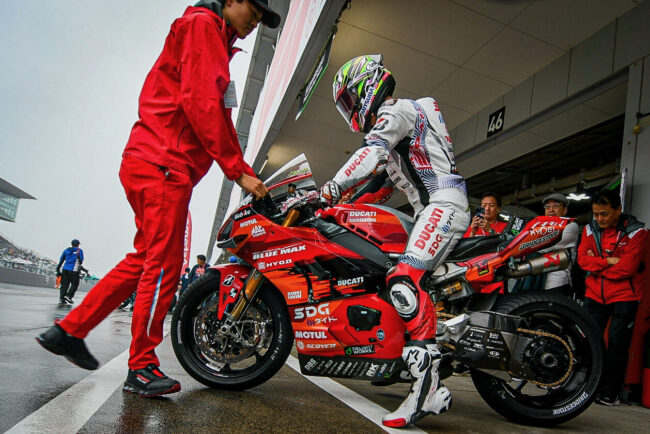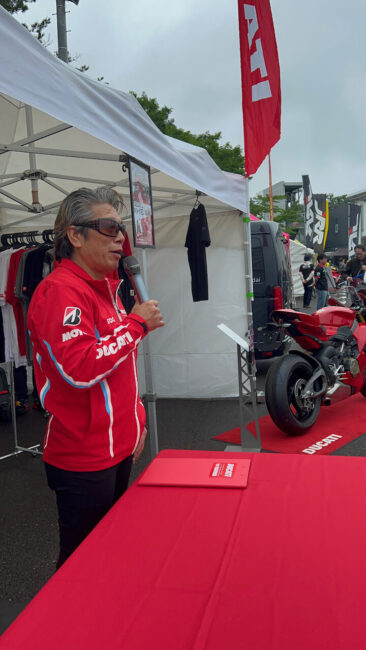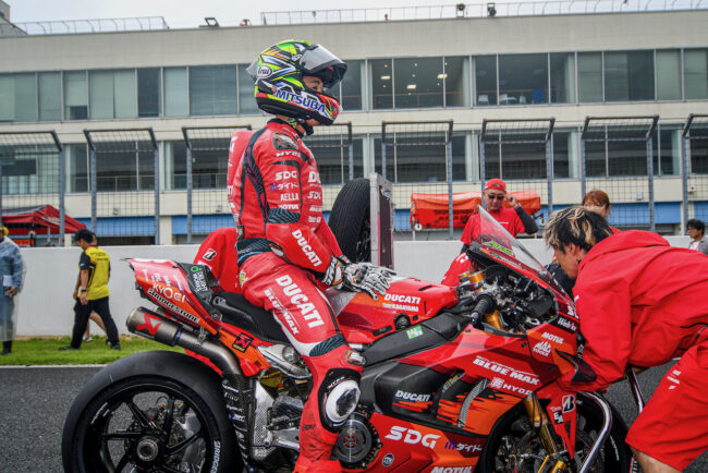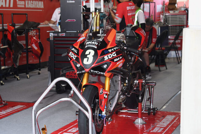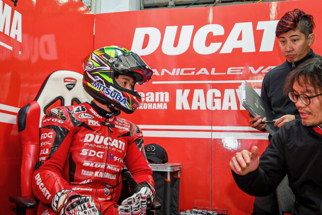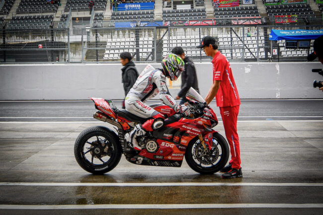 事前テストではケガで走行できない水野選手に代わり「代打、俺!」の加賀山監督が自らPanigaleV4Rを走行
