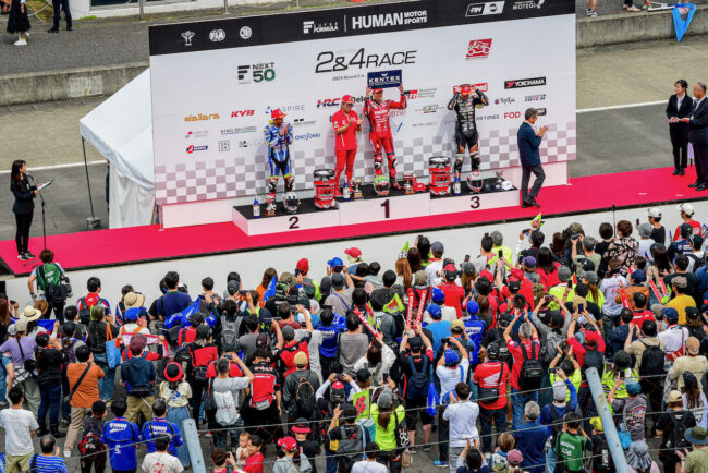 レース2の表彰台ではプレゼンターにモトクロスのスーパースター下田丈選手が登場