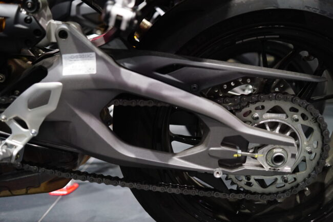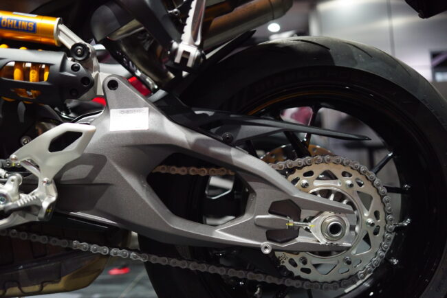 比べてみると新型Streetfighter V2のスイングアームが長いのがわかると思います。