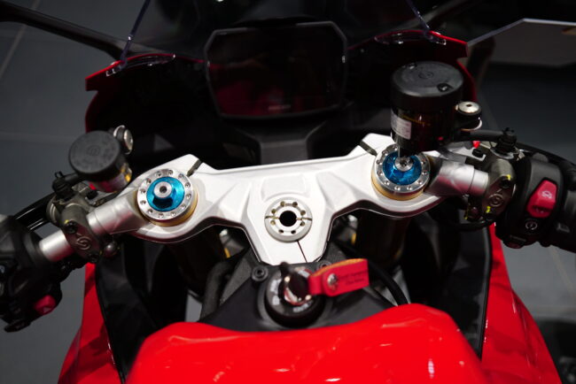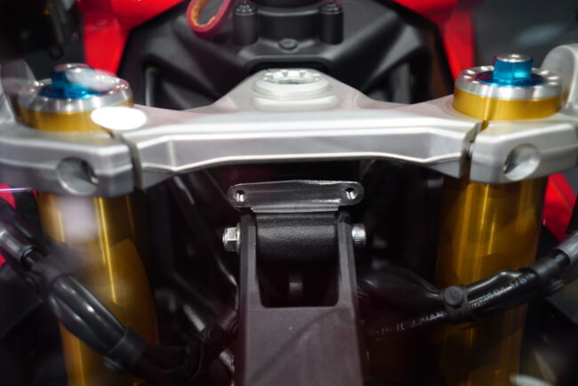 余談ですがさらに違いとしてSグレードは2台ともオーリンズサスペンションを装備していますがトップキャップのカラーが新型Panigale V2はよくあるブルーアルマイトですが