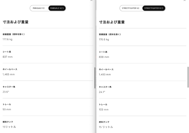 キャスター角も新型Streetfighter V2は新型Panigale V2より角度が寝ていてトレール量が+10mmとなっています。