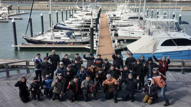 到着してからはマリーナで集合写真を撮ってからに施設内あるブルーモーメントさんへ