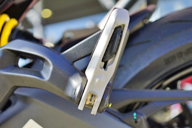 両持ちのスイングアームとなったリアホイールには245㎜径のローターにブレンボの2ピストンキャリパー
