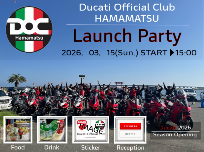 3月15日のDucati Official Club Hamamatsu Launchpartyの皆様のお越しをお待ちしております。
