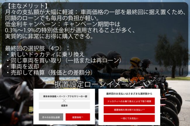 ドゥカティの「デスモプラン」は、最終回(3年または5年後)の買取保証価格(残価)を据え置いてローンを組むことで、月々の支払額を大幅に軽減できる「残価設定型」のオートローンです