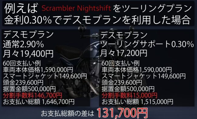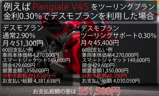 このツーリングサポートプラン利用と通常利用では例としてスクランブラーナイトシフトでは約13万円、パニガーレV4Sでは約35万円と車両金額が大きい程とてもお得に購入が可能なプランが用意されています。