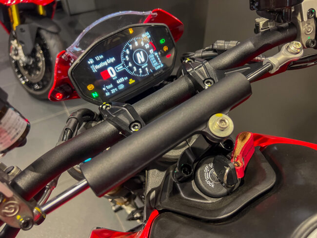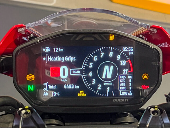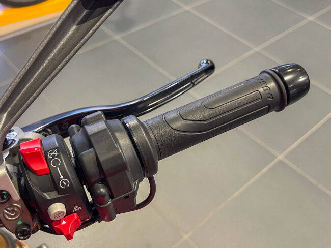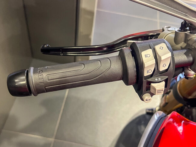 ドゥカティパフォーマンス製のグリップヒーター、純正オプション品なのでグリップの太さも変わらず液晶メーター内で3段階の暖かさ調整が可能です。