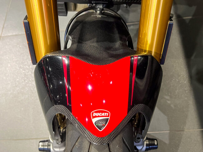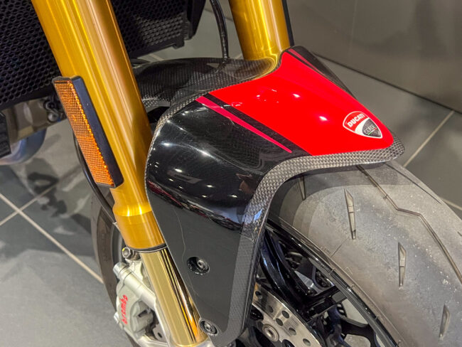 通常はマット仕上げのカーボン地のみとなるドゥカティパフォーマンス製のカーボンフロントフェンダーですが純正カラーにマッチするオリジナルペイントクリア塗装済みに仕上げていてノーマルよりもプレミアム感のある仕上がりとなっています。