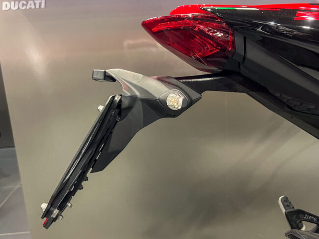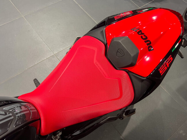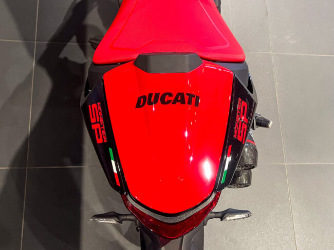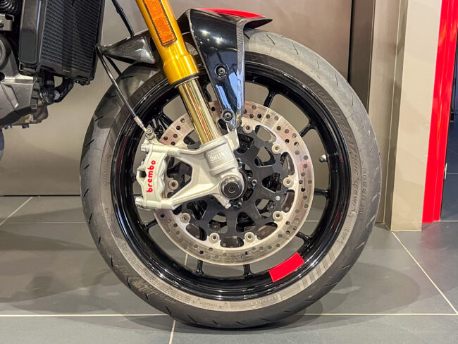 111psを発揮する937ccテスタストレッタ 11° エンジンはノーマルモデルと同じスペックですがリチウムイオンバッテリーを採用するなどノーマルモデルよりも2㎏軽量化されたSPの装備重量は177㎏と非常に軽量な車体となります。