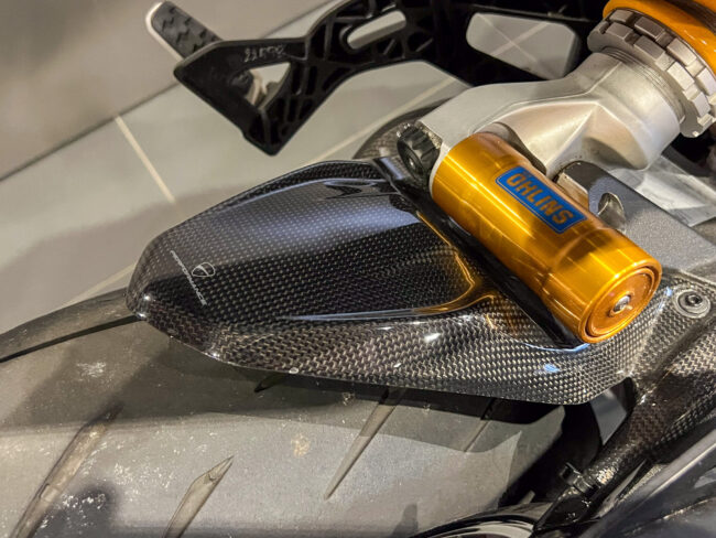同じくドゥカティパフォーマンス製のカーボンリアフェンダーも通常のマット仕上げからクリア塗装処理を施しています。